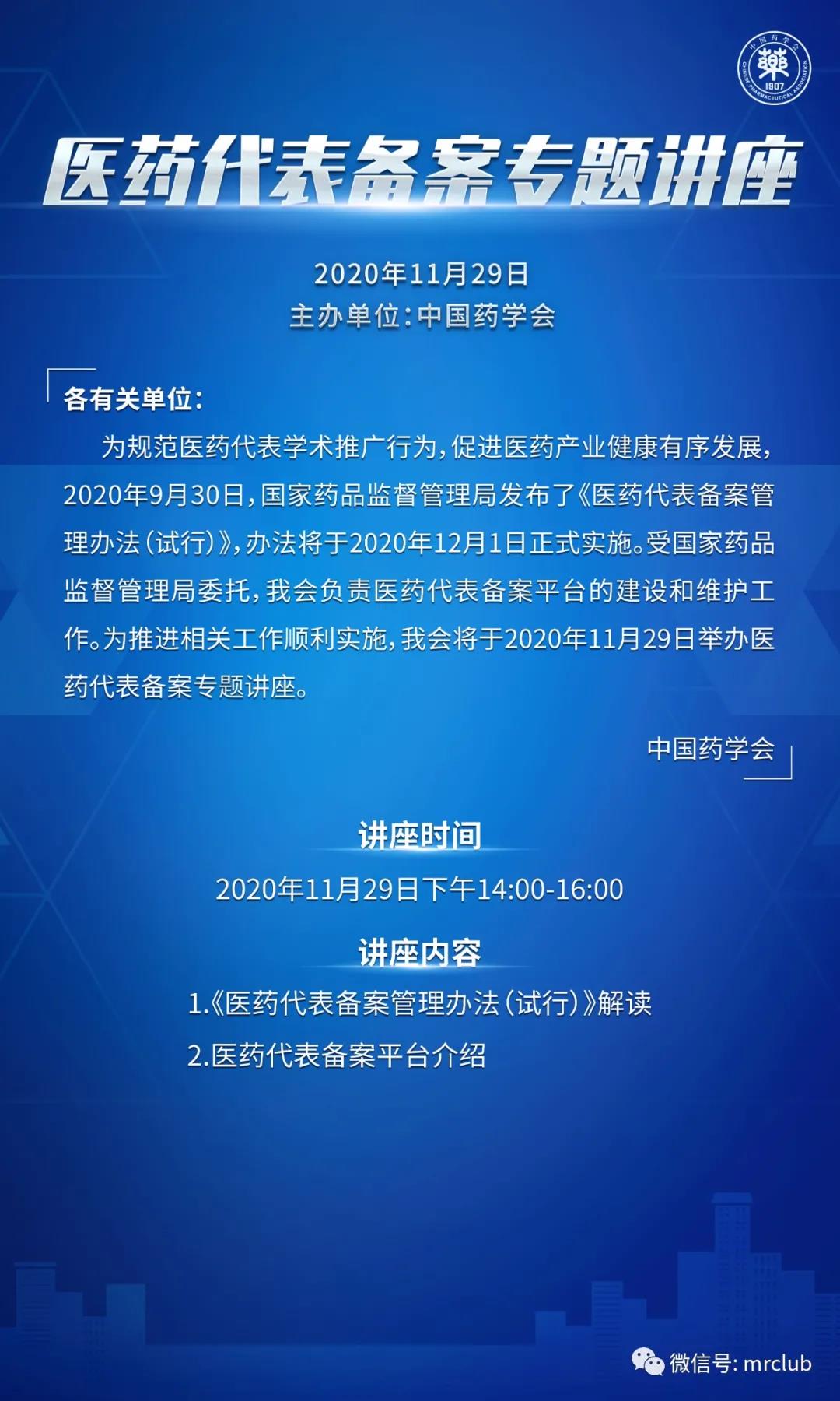 通知表示,为规范医药代表学术推广行为,促进医药产业健康有序发展,2020 年 9 月 30 日,国家药品监督管理局发布了《医药代表备案管理办法(试行)》,办法将于 2020 年 12 月 1 日正式实施。而为了推进相关工作顺利实施,中国药学会将于 2020 年 11 月 29 日举办医药代表备案专题讲座。